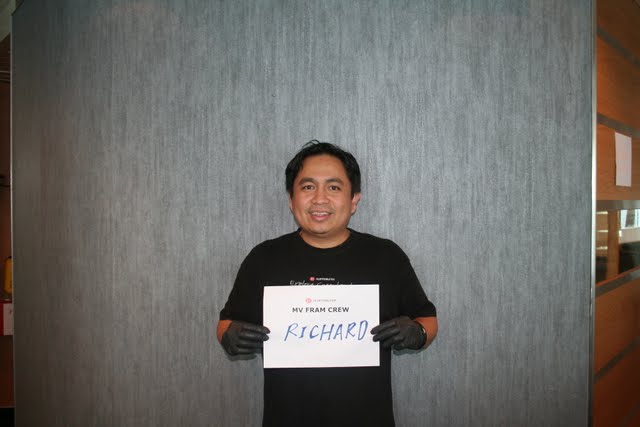 When the search started Deck department found the penguin and won this first game of the Olympics. It took a toll on quite a few of us having to run like crazy people up and down the decks after ha heavy barbeque dinner. Chef  Eduardo shows how most uf us felt afterwards. On Sunday there were three new games amongst them were egg race and "Guess the Word". The score is now a tie between Deck and Dining, that can change, keep following the Olympics on the FRAM!!