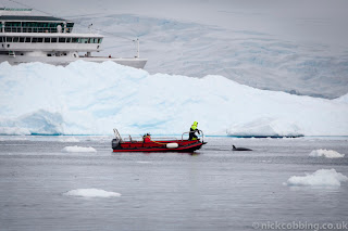 Our plan A for the morning has been the Ukrainian Vernadsky Station, but the wind forced our expedition leader Karin into plan B. And we can say only, Plan B – ice cruising in the Lemaire Channel - worked out wonderful. Dressed up warmly in special floating suits all passengers had the possibility for a 30 minute ice cruise. The ice looks so different if you can watch it directly from the water level.  Dark blue ice was covered with clear white fresh fallen snow. The Polar Circle boat driver made their way through the very dense ice to show us the wildlife, like sea birds, Crab eater seals and Leopard seals. This cruise will be unforgettable for all passengers.